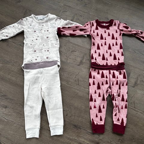 Deilig ullsett fra Name it str 80. Settet inkluderer en langermet body med knappelukking i skrittet og traktor på brystet og matchende bukse med elastisk midje og ribbestrikkede mansjetter i stripemønster. Settet er laget i et litt tykkere ullstoff enn de vanlige ullsettene. Pent brukt uten synlige feil eller mangler.