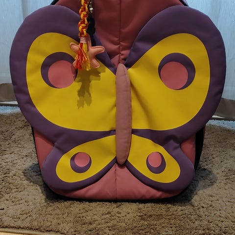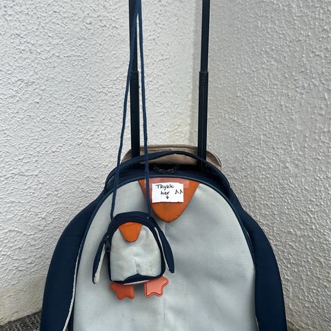 bag fra Samsonite, som er en del av en barnekoffert-serie. Den har aldri vært i bruk og har fortsatt original etikett. Har ligget lagret, og har fått noen mindre merker – disse er ikke forsøkt fjernet og kan trolig vaskes bort.