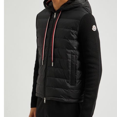 Moncler Jakke i størrelse M for herre, farge svart. Jakken har en kombinasjon av materialer med polstret frontpanel og strikkede ermer og rygg. Utstyrt med glidelås og to brystlommer med klaff. Logo på venstre arm.