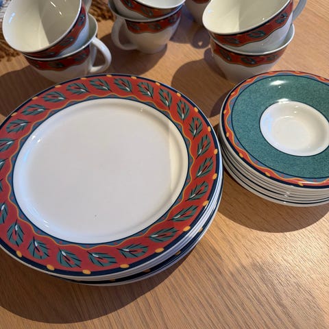 Serviset er i god stand, litt krakelering på noen av tallerkenene.
