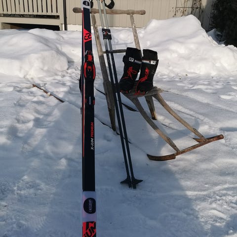 Atomic Classic langrennsski. Skiene er utstyrt med bindinger og egnet for klassisk langrenn.