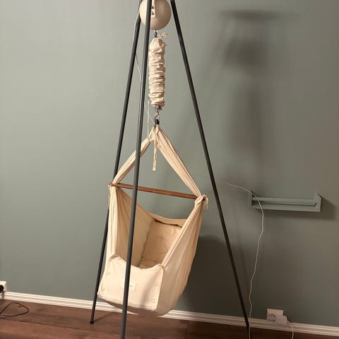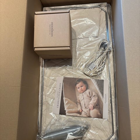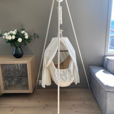 Vil du ha en Moonboon som både kan brukes om dagen, natten og på reise? Det ble en redder for oss! Vi selger vår lite brukte Moonboon, da den ikke brukes lenger. Vi har brukt den ca 2 mnd da barnet var 1-3 mnd. Vi har kjøpt hengevuggen brukt, så den er brukt av to barn. Den ovale vuggen er også kjøpt brukt, men så og si kun brukt av oss, da barnet i familien vi kjøpte den av ikke likte den. Her fikk vi med en helt ny fjær, som derfor bare er brukt i ca 2mnd (dere får derfor med fjærx2). Vi har også karmbeslag som gjør at dere lett kan ta med moonboonen på reise.
