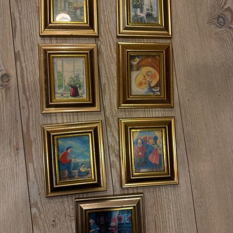 5 bilder med ulike motiv selges. Rammene er flotte, og kan selvsagt også brukes til andre bilder / foto etter ønske. Lysåpning ca 11,5 x 7,8 cm. Uten glass. Selges samlet for 100 kr.