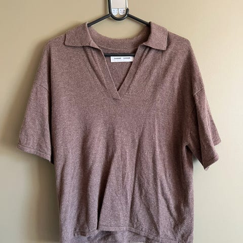 Brun/terracotta t-skjorte med krage i str S (stor i str). Bredde:52, lengde:68. Brukt et par ganger