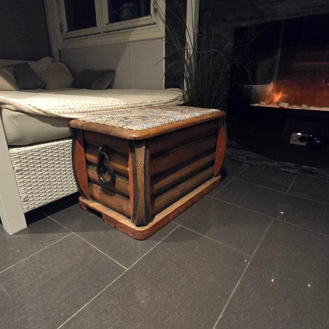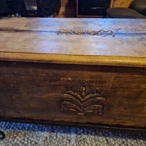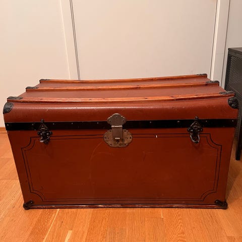 Kiste med smijern beslag, skinn trekt lokk