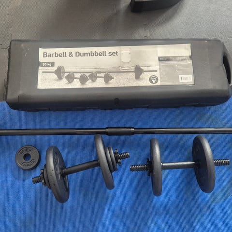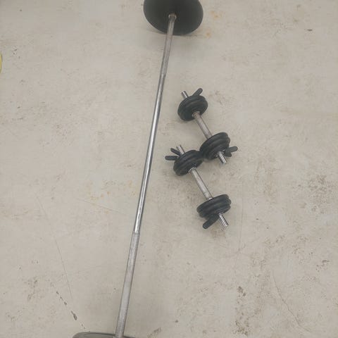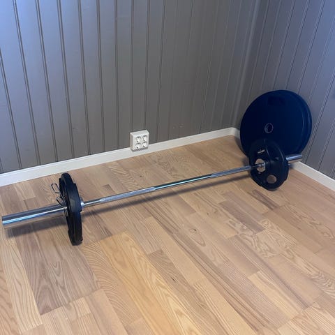 Selger vektstang med skiver. 4 stk stor skiver og 2 stk små skiver. Skivene låses med mutter på sidene.