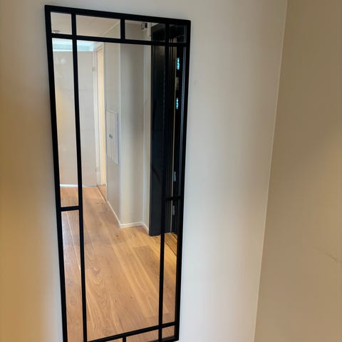 Speil med spiler/ramme i svart og beige farge. Rektangulært design med stripete mønster på rammen. Egnet for bruk i hjem eller kontor for speiling og dekorasjon.
