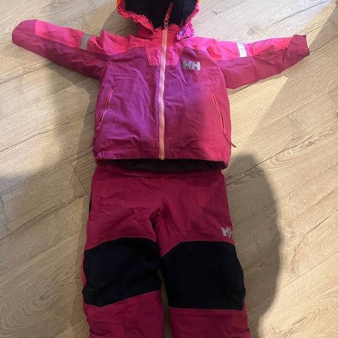 Skallsett Helly Hansen. Jakke pent brukt, bukse har to hull som vist på bilde. Kan lappes. Disse er på bakside. Har fungert helt fint til bruk som den er.