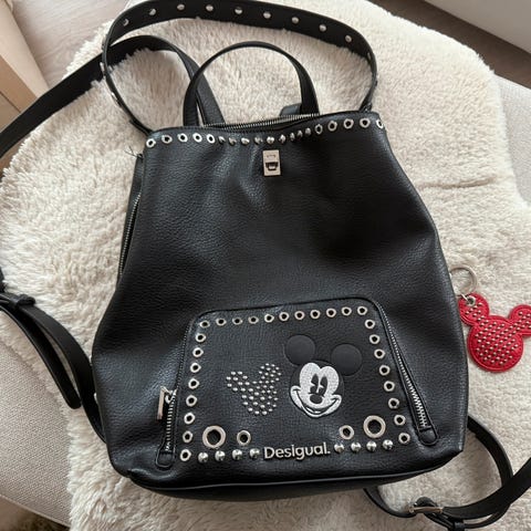 Ryggsekk/veske i svart kunstlær med preget Mickey Mouse-design av Disney. Ryggsekken har røde detaljer og inkluderer en nøkkelring. Den har flere rom, inkludert et hovedrom med glidelås og et ytre glidelåslomme.