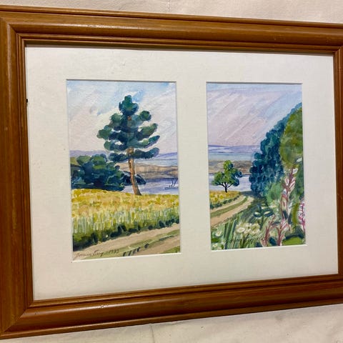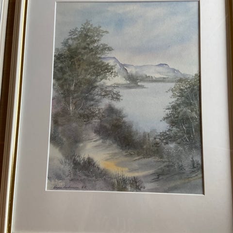 Vakker og stemningsfull original akvarell malt av Gudrun Horne, signert og datert Egersund, november 1951. Motivet viser bjørketrær ved vannet i myke, naturlige fargetoner – et typisk norsk naturmotiv fra midten av 1900-tallet.