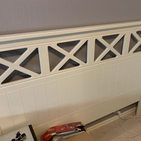 Tøff Senge gavl med nagler ig beslag. Malt hvit. Er fra serien Bombay, så har vært brun. Ett lite tips; sage beina av, sette understell på og en glass/plexi plate over, blir da ett tøfft bord.