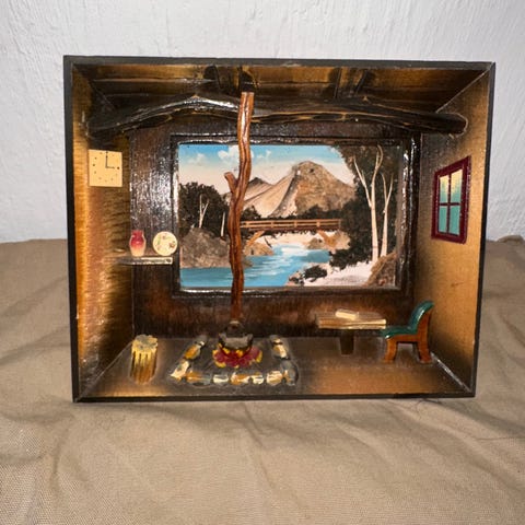 Veggbilde i tre med relieff, utrolig detaljert, fiskehytte (japansk?) u/skader