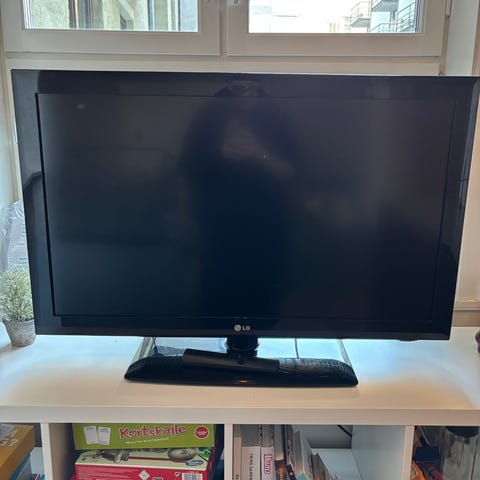 LG TV LCD 32 tommer svart med fjernkontroll. TV-en har flere tilkoblingsmuligheter, inkludert HDMI, komponent, kompositt og antenneinngang. Skjermstørrelse på 32 tommer, egnet for bruk i hjem eller kontor. TV-en har et stativ for plassering på bord eller hylle.