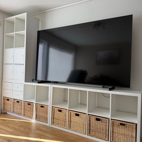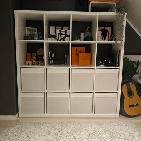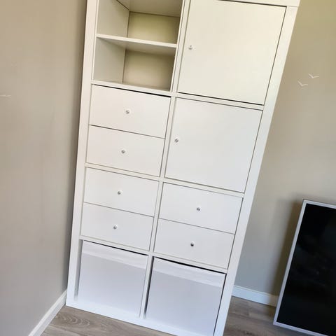 Kallax hylle med både dører, skuffer og oppbevaringsbokser inkludert. Selges som den er. Godt brukt og synlige merker som på bildene, men fortsatt god i bruk. Kjekt med både skuffer, skap og oppbevaringsbokser til ulike behov for oppbevaring på f.eks. et barnerom.