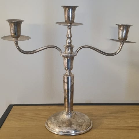 Fin 3 armet lysestake i metall. Blir dekorativ med lys i - fin til høytider med gule påskelys og røde julelys.