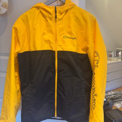 Champion Jakke i størrelse Large for herre, svart farge. Jakken har knappelukking, elastiske mansjetter og logo på bryst og ermet. Materialet er lett og for utendørs bruk