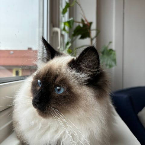 En katt til adopsjon. Hun er en huskatt fordi hun flyttet til et nytt hus, og jeg har ikke lov til å ta henne med meg.