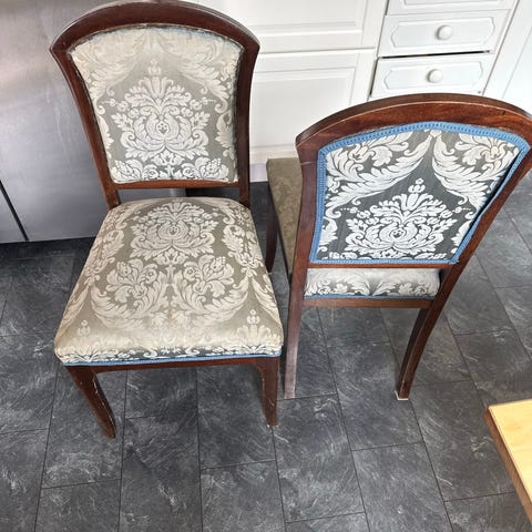 To gamle håndlagde spisebords stoler (omtrent 100 år). Stolene er lagd av bjørk. Putene trenger en rens, eller bør trekkes om. Pris pr. stol.