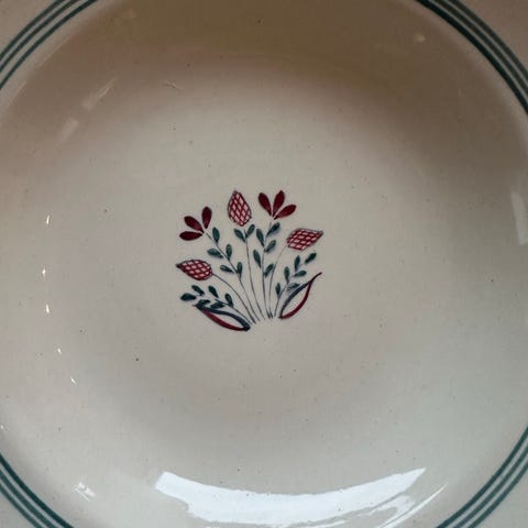 1 dyp tallerken, 20 cm. Kr 40. Bruksmerker+ «strek» i glasuren.