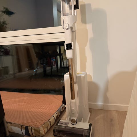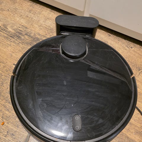 Dreame D9 Robotstøvsuger i hvit farge. Ladestasjon, støvbeholder, og mopp Rengjøring av gulvflater