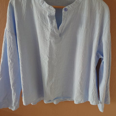 Ubrukt bluse/skjorte selges. Løs passform. Den har kun hengt i skapet, og jeg husker ikke hvor eller når den er kjøpt. Uten merkelapp.