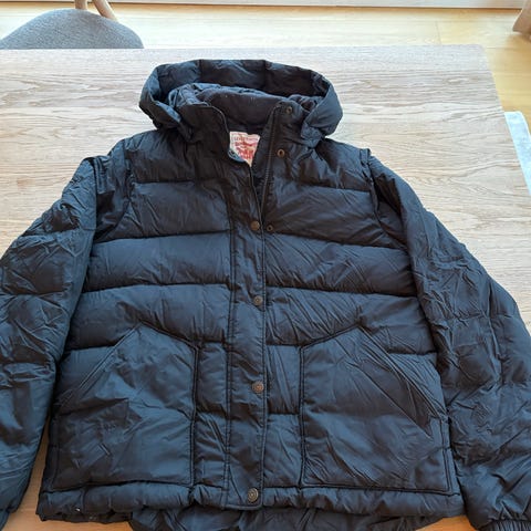 Flott dunjakke fra Levi’s selges rimelig. Avtagbar hette, fine kneppedetaljer i sidene (se bilde). Str. XS, men tilsvarer str. 158 cm. Regulerbar livvidde. God og varm dunjakke, virkelig en favoritt gjennom vinteren. Kan sendes.