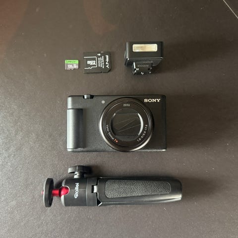 Sony kamera kompakt med vribar skjerm og ekstern mikrofon. Kameraet er svart og har en skjerm som kan vris for enklere fotografering og filming fra ulike vinkler. Egnet for både foto og videoopptak. En ripe i skjermen som vist på siste bildet. Sendes i original pakken.