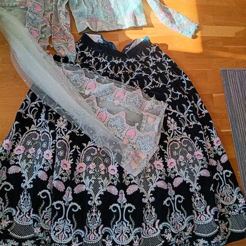 Jeg selger dette flotte settet med skjørt og jakke. Jeg har selv kjøpt det brukt, det er hjemmesydd. Skjørtet er fotsidt og jakken kort med ballongarmer. Jeg har funnet en skjolde på skjørtet, men den syntes veldig lite grunnet mønsteret (jeg så den ikke før jeg hadde eid det en stund). Kan sendes for 69kr