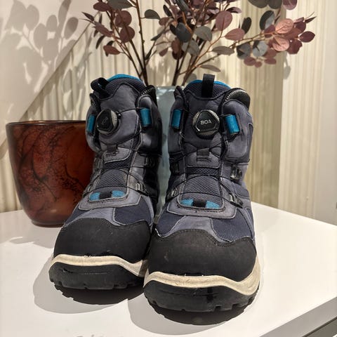 ECCO vinterstøvler med goretex i størrelse 40. Skoene er hovedsakelig svarte med detaljer i blått og grått. De har borrelås-stropper for enkel justering og lukking. Yttersålen har et mønster for grep, og skoene er designet for å gi støtte og komfort til barnets føtter.