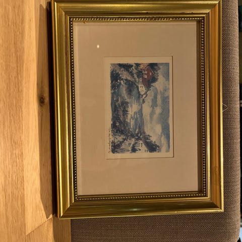 Kunstverk, (litografi el. tegning?) som viser en liten landsby.