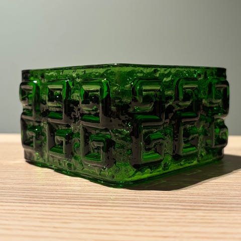 Søt grønn fugl i glass. Benny Motzfeldts souvenirproduksjon av fugler og andre glassdyr for Hadeland er nesten aldri merket. Denne er heller ikke merket, og den avviker litt fra Bennyss fugler. Den kan dermed være en kopi av Benny Motzfeldt sine små isfugler for Hadeland,.