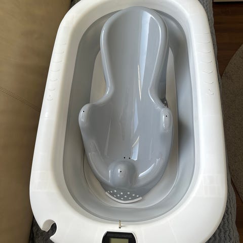 Sammenleggbart babybadekar i plast i hvit og grå farge.