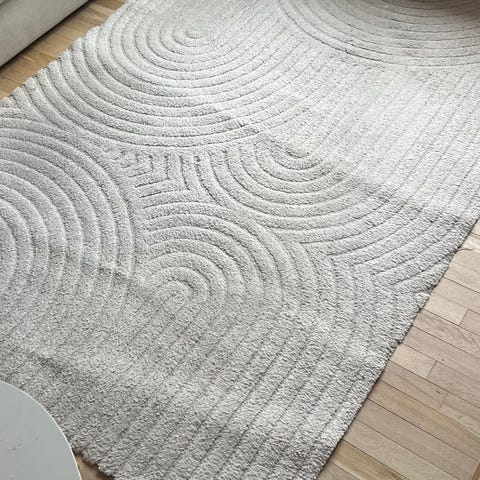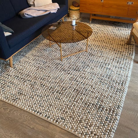 IKEA gulvteppe i ull. Hvit farge med små fargerike innslag. Har en struktur med små bobler i forskjellige farger.