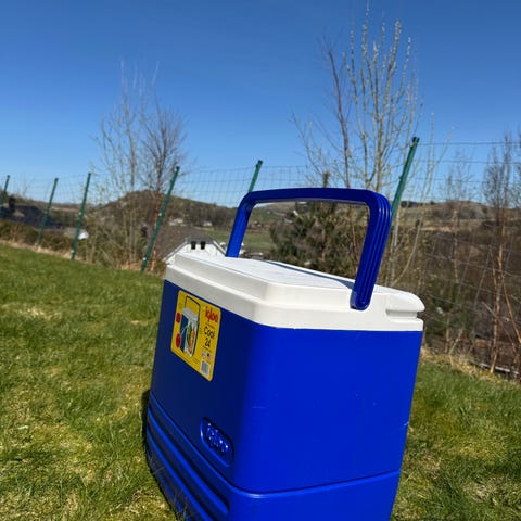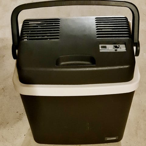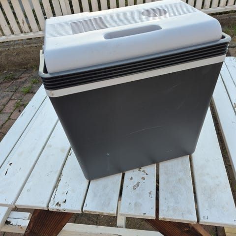 Kjøleboks i blå plast med hvite detaljer. Fra Biltema. Kobles med ledning til «sigarett-tenner» i bil.