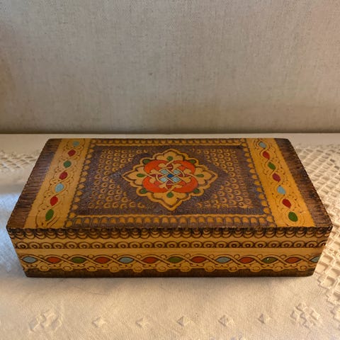 Kan brukes som smykkeskrin eller dekor. Nostalgisk og fint skrin.