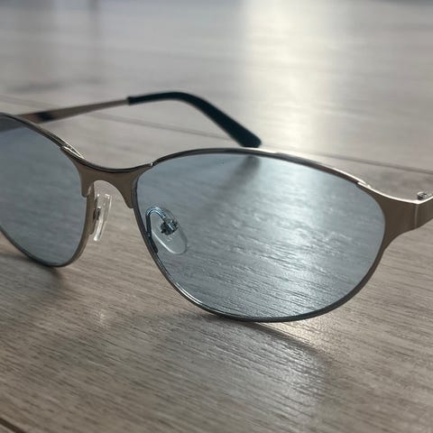 Blå Retro Baby Banz med hodebånd. Ca 1 - 3 år. Sitter godt. Noen riper i innfatningen og på glassene. Tilhørende stoffpose.