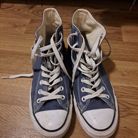 Converse sneakers joggesko i blå farge, størrelse 38. Skoene har klassisk design med gummisåle og snøring. Egnet for hverdagsbruk og uformelle anledninger. Pent brukt.
