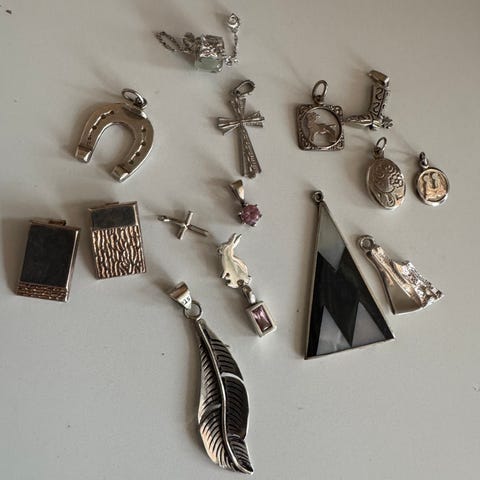 Fint og spesielt smykke, håndlaget i Frankrike. Anheng i glass og metall, kjede i tekstil/snor. Lås i metall.