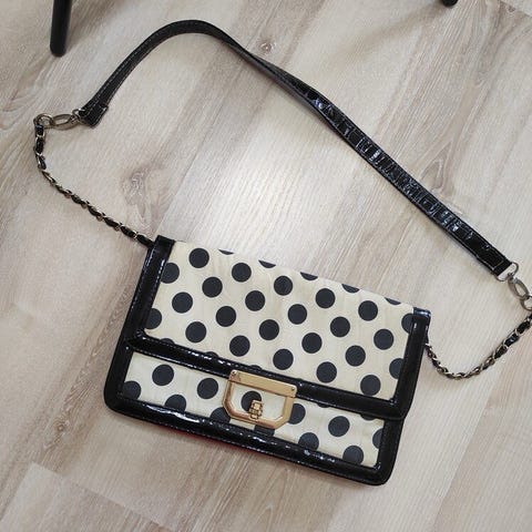 liten retro veske fra Banned. den begynner å bli noen år nå. men er kun brukt noen ganger. Ellers har den vært lagret i støvpose, mørkt og tørt. inneholder 1 stort rom og en liten lomme.