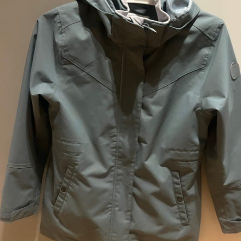 Selger en pent brukt mørkeblå skalljakke fra POP.