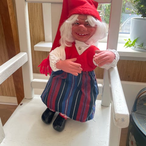 En Arne Hasle nissekone med bunadH: 45 cm. I fin stand. Den hvite skjorta trenger en vask. Merket Arne Hasle Norge under skoen. Kr. 1000,-