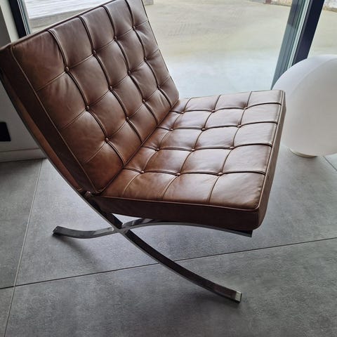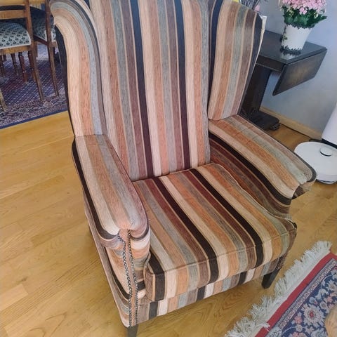 Flott stol med fotskammel! Høyde 95cm, bredde sete 88cm, bredde krakk 75cm. Dessverre skadet boltfeste på øverste puta, usikker på hva som har skjedd der, men tidligere eier har prøvd å lappe sammen md Tec7 eller lignende, antagelig gåene gjenger på mutterinnsaten. Ellers litt solfalming, et par flekker på stoltrekket, liten rift på fotskammelen samt mangler en av boltene på fotskammelen. Alt veldokumentert på bilder. Hadde tenkt meg en jobb på denne, men innser vel at tiden ikke strekker til så selger denne videre.