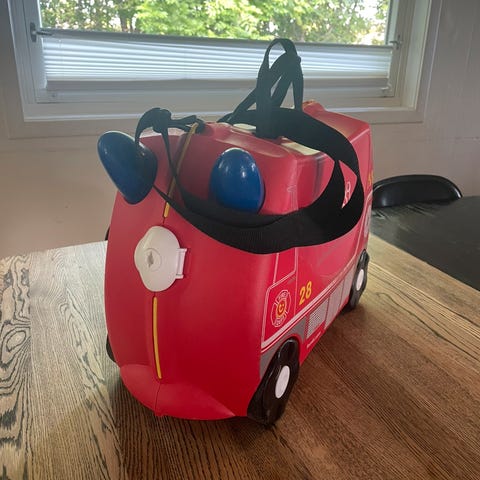 Trunki trillekoffert som barn kan sitte på mens voksne kan trekke med bånd som følger med. Har også nøkkel på båndet som gjør at kofferten kan låses.