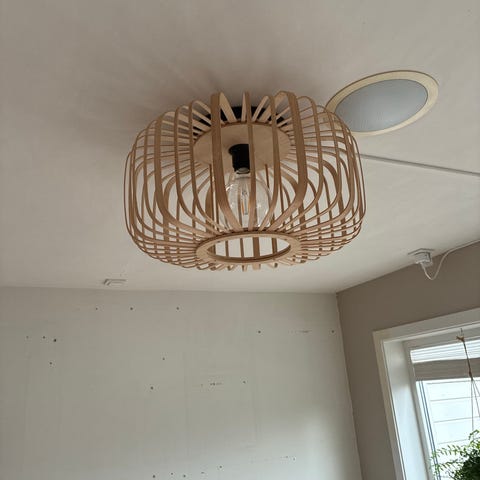 Jeg tilbyr en fantastisk taklampe laget av naturlig tre, utstyrt med dekorative smartpærer. Du kan styre dem via en app, og pærene gir deg muligheten til å justere lysfargen – fra varm til nøytral og kald. I tillegg kan LED-lysene skifte farger og skape en unik atmosfære.