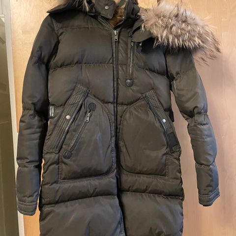 Olivengrønn dunparkas fra danske Modstrøm. Svært lik kvalitet som feks Pajar Cougar og Parajumpers Long Bear. Hetten er foret med fake pels, mens kanten er ekte pels. Pen og varm parkas med strikk i midjen bak, som gir en feminin og slank silhuett. Ny pris 3700,- Selges kr 900,-