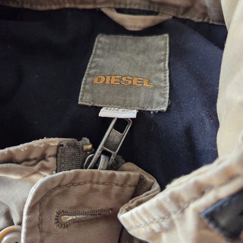 Diesel jakke i blå farge, størrelse XXL for herre. Jakken har quiltet design med glidelåser på lommer og er utstyrt med en kontrastfarget krage i plysjmateriale. Materialet og detaljene gir jakken et robust og stilig uttrykk.