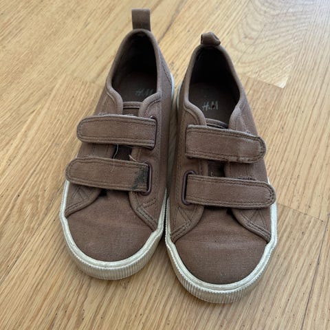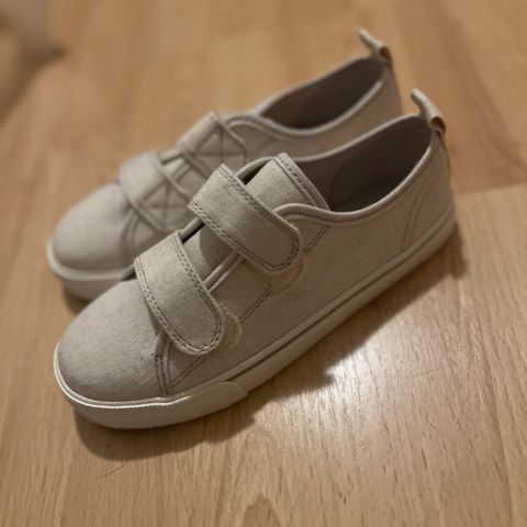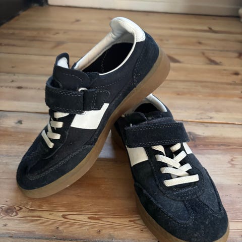 H&M barnesko i størrelse 28 for unisex. Skoene er svarte med hvite detaljer og har en kombinasjon av snøring og borrelås for lukking. Egnet for daglig bruk.
