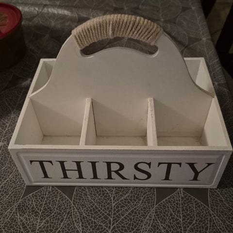 Morsom oppbevaringsboks, kan brukes til mye: sminke, penner og kontorrekvisita, miniatyrflasker, til badet, og sikkert mye mer. Har hjertepynt, og hanken er markert med bast. Shabby chic stil.