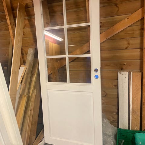 Glassdør i hvitt tre med 10 glassruter. Målene er ca. 204 cm i høyde og 112.5 cm i bredde. Frest spor til skyvedør. Feilleveranse for 10 år siden. Ved kjøp av skyvedørkasett til 120 dør har du en flott stor skyvedør i glass. Er en liten sprekk i ruten ca mitt på "hengselsiden"