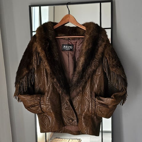Jakken er i svært god stand til alderen – vesentlig bedre enn det man vanligvis finner på markedet. Den har naturlig patina og mindre spor av tid, men ingen hull, eller store skader. Frynsene er hele og sømmer og fôr er intakt.